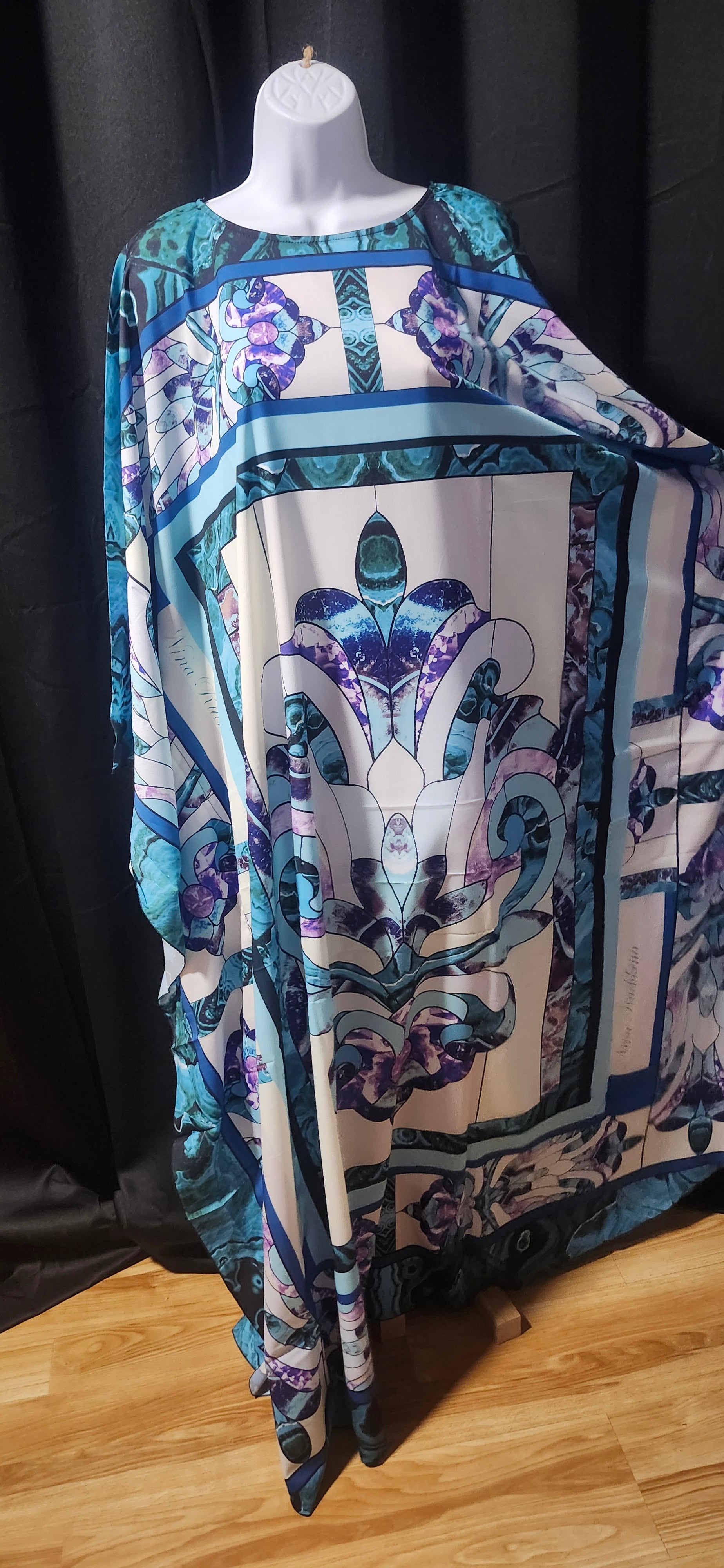 This exquisite Blue and Purple Floral Kaftanfull-length gown features a symmetrical, architectural floral design that mimics the intricate patterns of fine stained glass or luxury botanical tapestries.