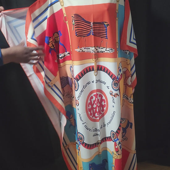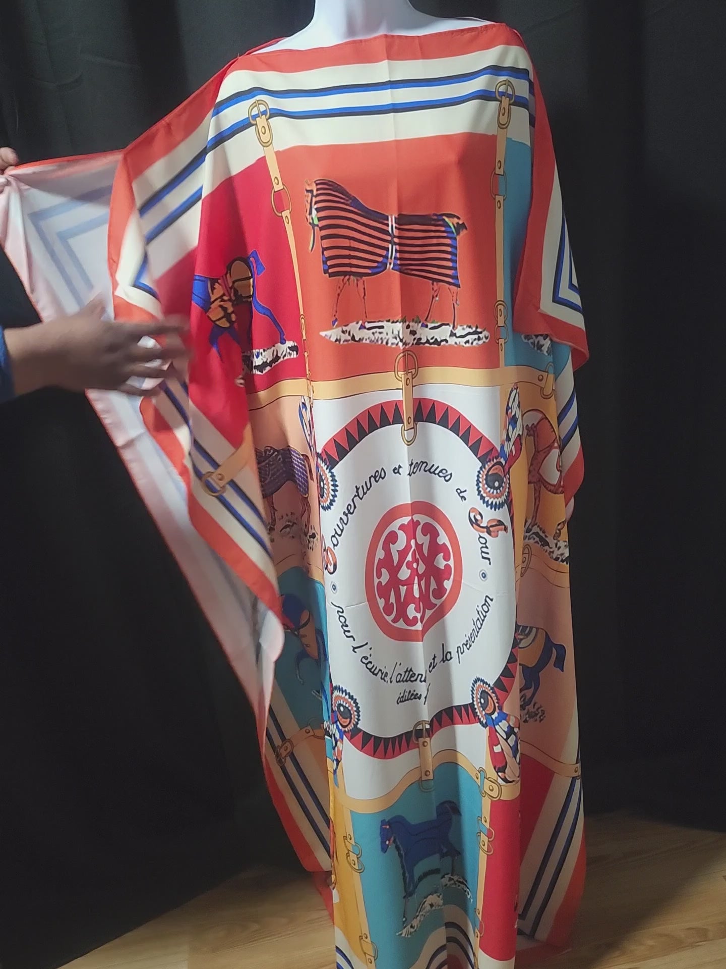 Go into your next event with effortless style in our Orange and White Silk-Like Kaftan. This breathtaking full-length dress features a sophisticated scarf-print design, showcasing majestic horses in vibrant blankets, decorative stirrups, and elegant buckle motifs.